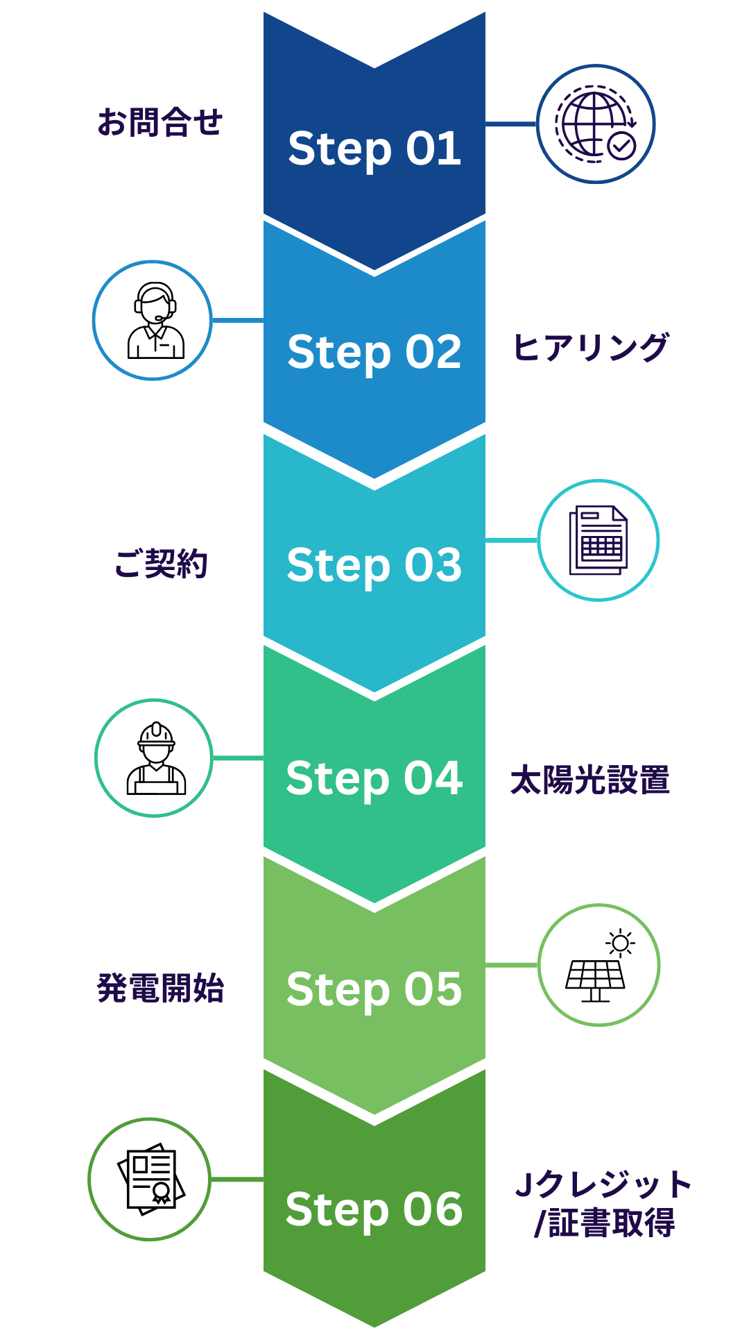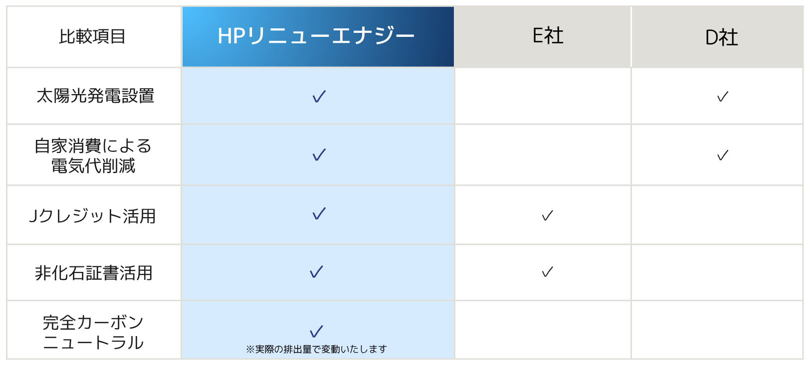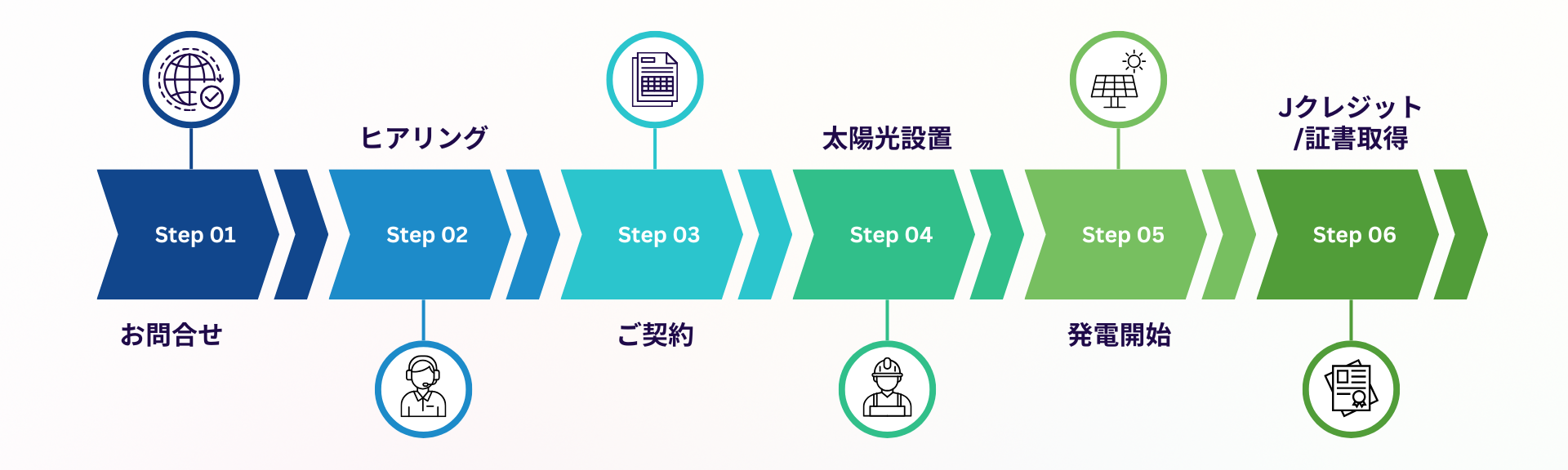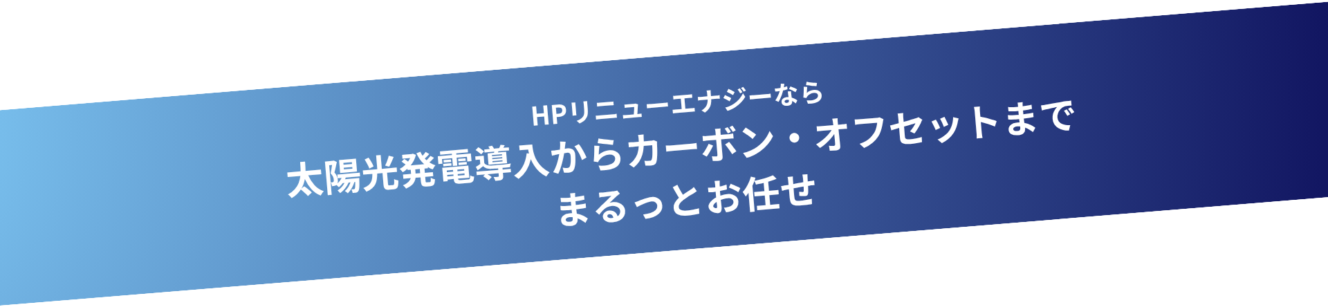 企業のCO2削減目標に こんなお悩みありませんか? 太陽光自家消費だけではカーボンニュートラル目標達成が困難になっている 電気料金の上昇が続き、さらなるコスト削減策が求められている 取引先や投資家からのESG対応要請に、十分に応えられていない その悩み、Jクレジット・非化石証書でも解決できます! そもそも、Jクレジット・非化石証書って何? 省エネや再エネ導入等によるCO₂削減量を国が認証し、クレジットまたは証書化したもの そのクレジットまたは証書化したものを売買できる仕組みです。 そのため、太陽光発電だけよりもコスト削減が大きくなります。 でも、手続きとか面倒そう。。本当に売買できるの? ポイント.01 太陽光発電からクレジット取得まで一括でサポート 太陽光発電の導入からクレジットの取得・活用までをワンストップで支援。専門知識不要で、スムーズにカーボン・オフセットを実現し、コスト削減と環境対策を同時に進められます。 ポイント.02 太陽光発電とカーボン・オフセットの組み合わせでコスト削減を更に10%以上実現 太陽光発電による電力削減に加え、カーボン・オフセットでCO₂排出も実質ゼロへ。環境負荷を抑えながら、全体コストをさらに10%以上削減し、企業価値の向上にも貢献します。 ポイント.03 初期費用無料! 登録手続きなどに費用は発生いたしません! 初期費用は一切不要。登録や手続きにかかる費用も発生しないため、導入時の負担ゼロでスムーズにご利用いただけます。 他社との比較 導入までの流れ よくある質問 Q. Jクレジットと非化石証書の違いは何ですか? A. 非化石証書には有効期限があり、取得した証書は原則その年度に使用した電力にしか充てることができません。それに対してJクレジットには有効期限はなく、創出されたクレジットは2031年3月31日まではJ-クレジット登録簿というシステム上で管理されます。 Q. なぜ太陽光自家消費とJクレジット/非化石証書を組み合わせると効果的なのですか? A. 太陽光自家消費で電気代を削減したCO₂削減分を“収益化”することができるためです。 Q. 契約期間は何年からですか? A. 特に契約の縛りはございません。 Q. 既存の太陽光設備でもプランに対応できますか? A. はい、可能です。弊社が施工管理していない物件でも問題ございません。 Q. このプランを導入すると、コストはどれくらい削減できますか? A. 削減効果は設備容量や使用電力量によって異なりますが、太陽光自家消費だけでも年間の電気代を20〜40%程度削減できるケースが一般的です。さらに、Jクレジット・非化石証書の活用によりCO₂削減分を収益化できるため、実質的なコスト削減効果はそれ以上になる可能性があります。 Q. Jクレジットや証書の申請は自社でやる必要がありますか? A. 必要ございません。全て弊社にお任せください。 Q. 導入から実際に発行されるまで、どのくらい時間がかかりますか? A. 設備の稼働後、データ計測や申請手続きなどを経て、初回のクレジット発行まではおおよそ6〜12か月程度が目安です。以降は定期的な発行サイクルに乗るため、よりスムーズにクレジットを取得できるようになります。 Q. CO₂削減量の算定根拠はどのように証明されますか? A. 基本的には遠隔監視等で確認するデータに基づいて算定いたします。 Q. 設備の保守や管理は誰が行いますか? A. 弊社にて太陽光施設の管理も行っておりますので、ご相談ください。 カーボン・オフセットの導入から、クレジット管理・運用、申請手続きなど一括サポート。 急な変更やお困りごとにも迅速に対応し、安心して脱炭素経営を進められます。 HPリニューエナジー株式会社 お問い合わせ窓口 03-5050-4943 受付時間◾️9:00〜17:00(土日・祝除く) 企業のCO2削減目標に こんなお悩みありませんか? 太陽光自家消費だけではカーボンニュートラル目標達成が困難になっている 電気料金の上昇が続き、さらなるコスト削減策が求められている 取引先や投資家からのESG対応要請に、十分に応えられていない その悩み、Jクレジット・非化石証書でも 解決できます! そもそも、Jクレジット・非化石証書って何? 省エネや再エネ導入等によるCO₂削減量を国が認証し、クレジットまたは証書化したもの そのクレジットまたは証書化したものを売買できる仕組みです。 そのため、太陽光発電だけよりもコスト削減が大きくなります。 でも、手続きなど面倒そう。。本当に売買できるの? ポイント.01 太陽光発電からクレジット取得まで一括でサポート 太陽光発電の導入からクレジットの取得・活用までをワンストップで支援。専門知識不要で、スムーズにカーボン・オフセットを実現し、コスト削減と環境対策を同時に進められます。 ポイント.02 太陽光発電とカーボン・オフセットの組み合わせで コスト削減を更に10%以上実現 太陽光発電による電力削減に加え、カーボン・オフセットでCO₂排出も実質ゼロへ。環境負荷を抑えながら、全体コストをさらに10%以上削減し、企業価値の向上
