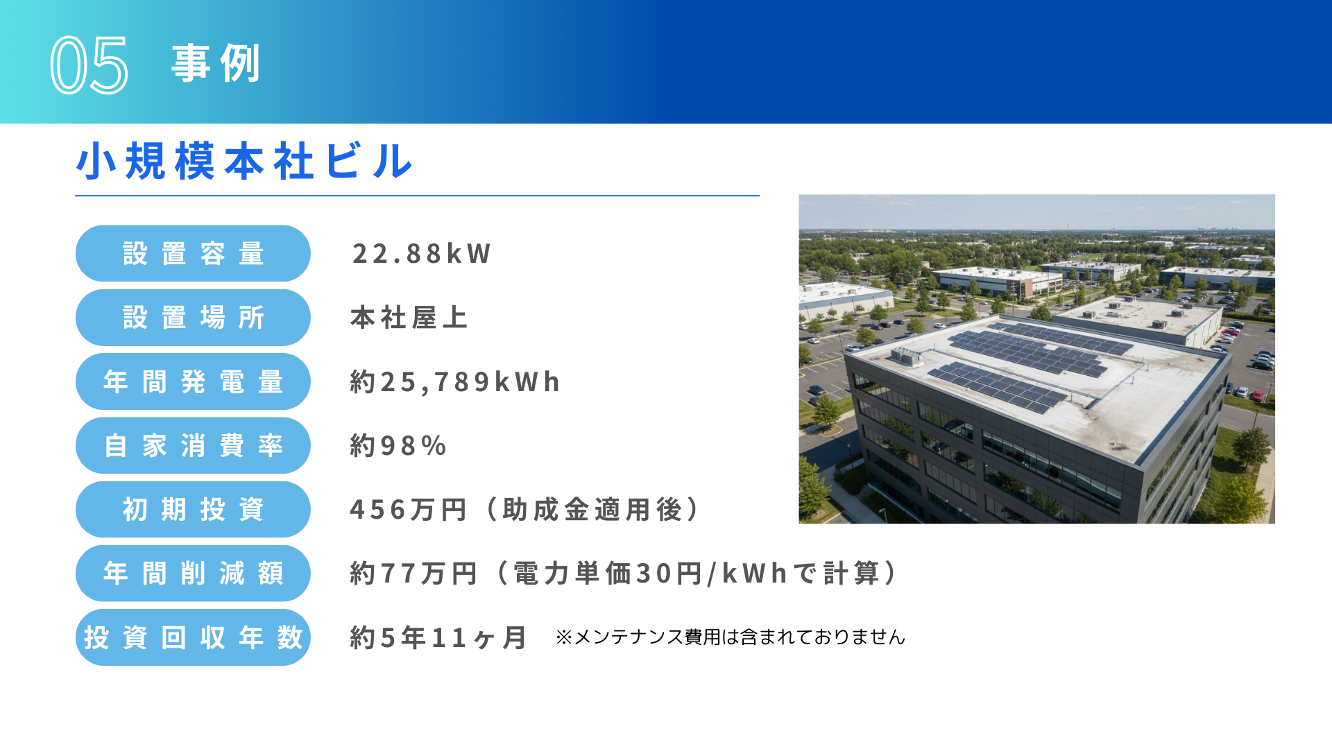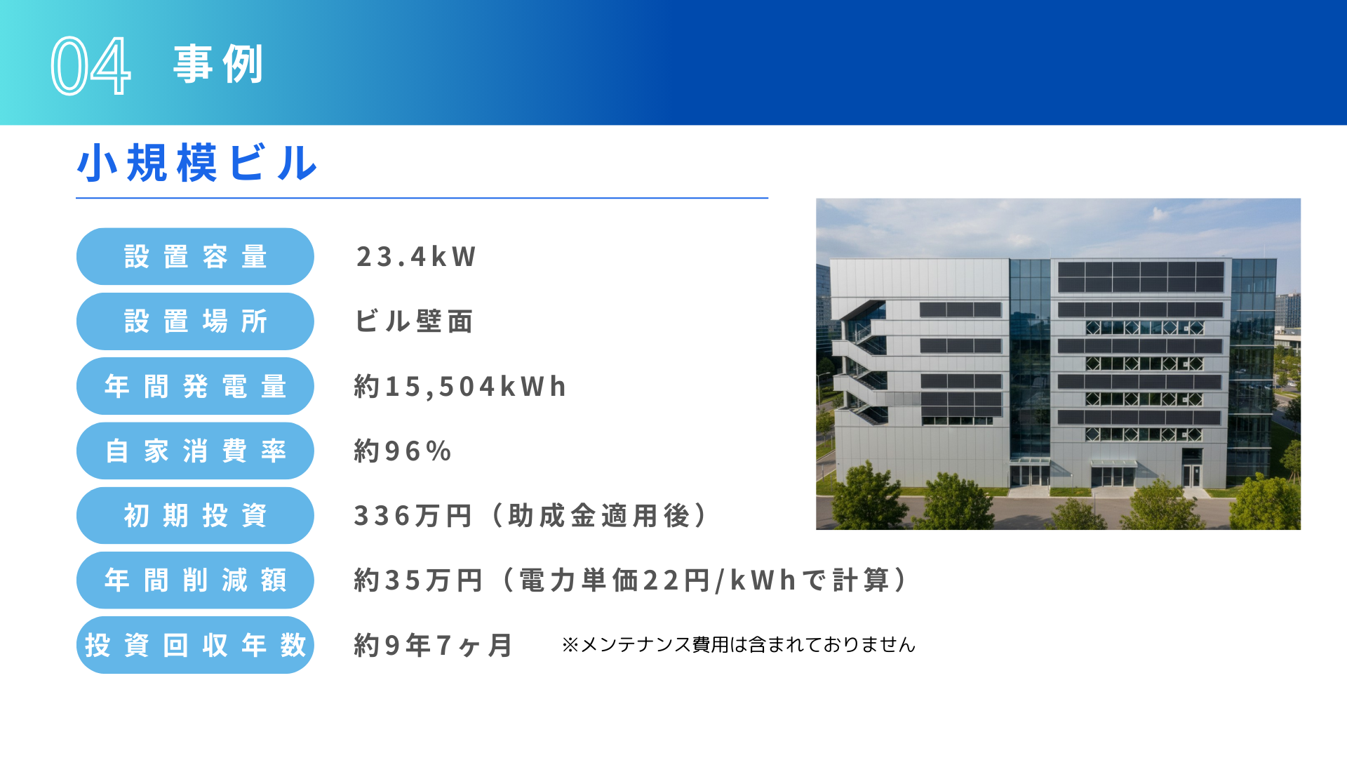 屋上に室外機がある関係で屋上設置不可案件。壁面を有効活用したご提案で、共有部分使用電力量の削減をご提案。